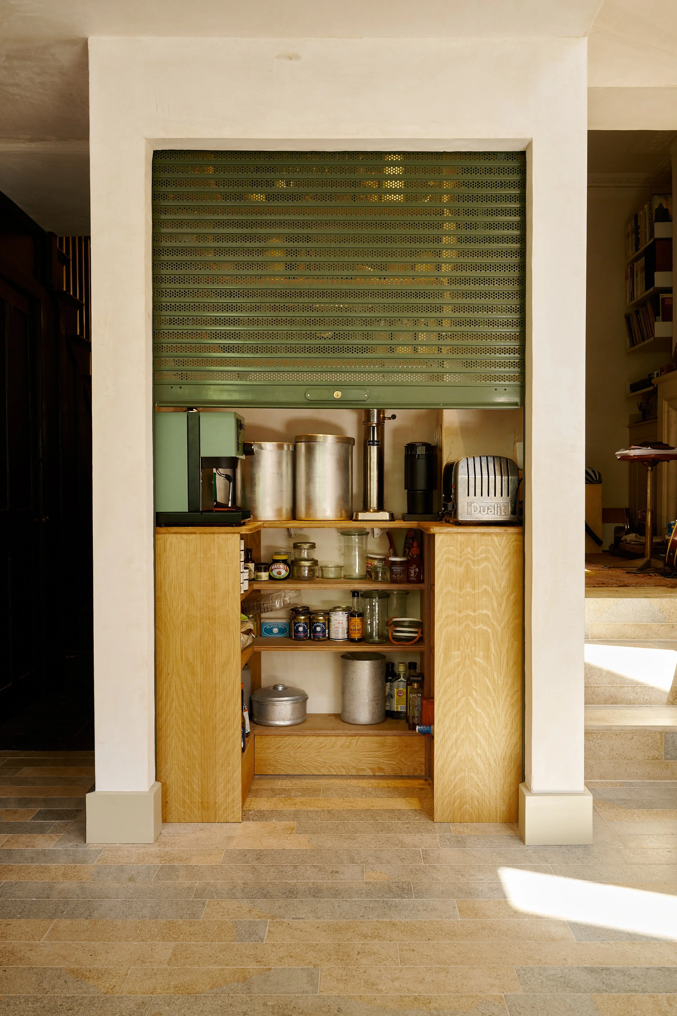 The larder is concealed behind a perforated roller shutter borrowed from a more industrial context. All cabinetry in solid birch ply.